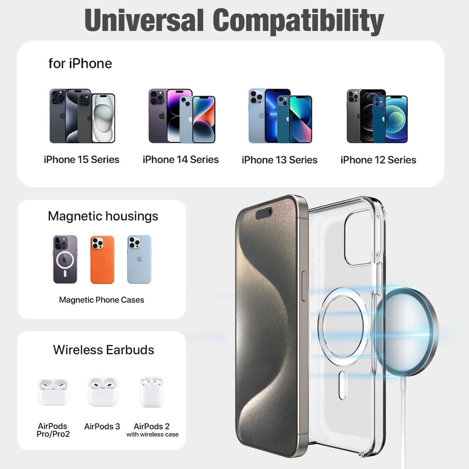 Compatible with iPhone 12, 13, 14, 15 series and other Qi-enabled devices supporting 5W, 7.5W, 10W, and 20W wireless charging.