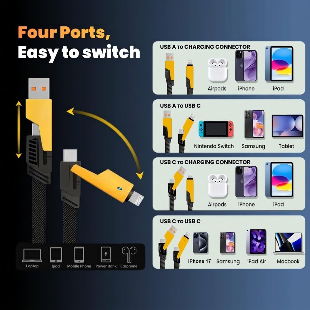 Multi-Device Convenience in One Cable:-Ideal for travel, home, office, and car use. No need to carry multiple cables—this 4-in-1 cable is compatible with iPhone, Samsung Galaxy, OnePlus, Xiaomi, Realme, Motorola & more.