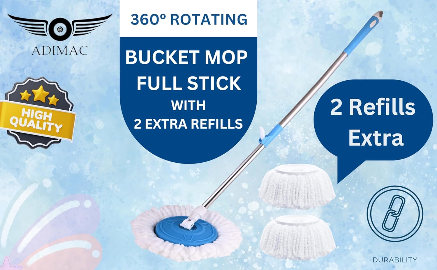 <br>360-Degree Rotating Pole: Effortlessly reach every corner and crevice with the innovative 360-degree rotating design.<br>Heavy-Duty Construction: Made with high-quality stainless steel and durable plastic for long-lasting use and reliable performance.<br>Ergonomic Design: Comfortable grip reduces strain on your hands and wrists, making cleaning easier and more enjoyable.<br>Versatile Use: Perfect for both home and office environments, ensuring cleanliness in every space.<br>Three Refill Mop Heads Included: Always be prepared for any cleaning challenge with three easy-to-replace mop heads.<br>Easy Assembly: Simple and quick to assemble, so you can start cleaning right away.<br>Efficient Cleaning: Designed to tackle tough stains and maintain daily cleanliness with ease.