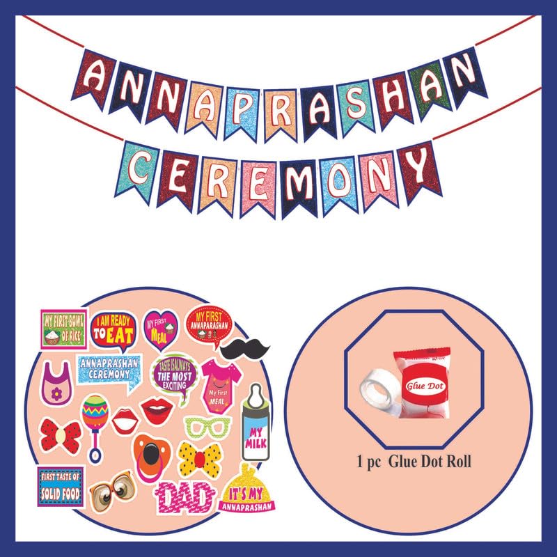 Make your child?s Annaprashan ceremony memorable with this all-in-one decoration kit. The centerpiece is a large, vibrant ANNAPRASHAN CEREMONY banner in multiple colors with glitter details, designed to brighten any party backdrop or wall. Alongside the banner, the kit includes over 20 photo booth props themed around baby essentials and fun sayings to capture joyful moments with family and friends. Crafted from thick cardstock with bright, crisp prints, these props feature baby bibs, bottles, pacifiers, quirky glasses, moustaches, lips, and speech bubbles such as My First Meal and I Am Ready to Eat. Each piece comes with sticks and adhesive dots for easy assembly, encouraging guests to take lively photos that become cherished memories of this important milestone. This Annaprashan kit is suitable for indoor or outdoor celebrations at home or event spaces. The banner includes pre-punched holes for quick hanging, and the lightweight props can be used alongside other decorations like balloons or curtains. Whether hosting a small family gathering or a larger party, this kit adds charm and excitement to your baby first rice feeding ceremony.