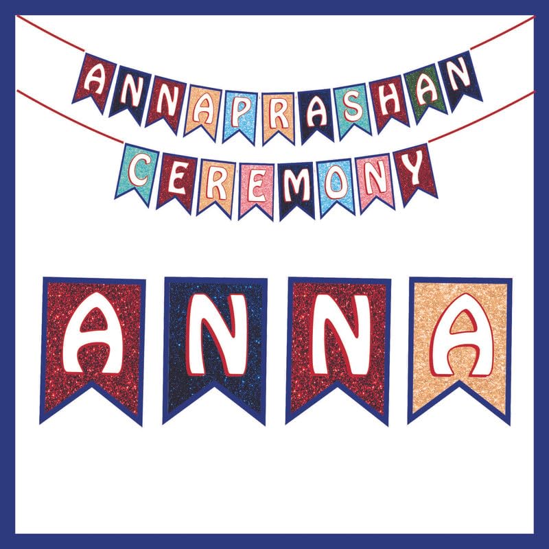 Vibrant Annaprashan Banner: Features a large two-string multicolor banner spelling ANNAPRASHAN CEREMONY with glitter accents and pre-punched holes, making it easy to hang for an eye-catching backdrop at your baby?s rice-feeding celebration.