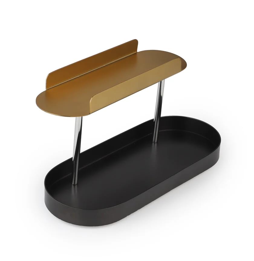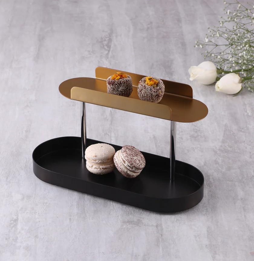 “Deco Offset 2 Tier Platter is inspired by the Art Deco architecture and is crafted in Stainless Steel. The beautiful black and matt gold coating calls for a luxurious appeal that exceeds the realm of a coffee table and can easily incline into a breakfast nook or a bar space. “