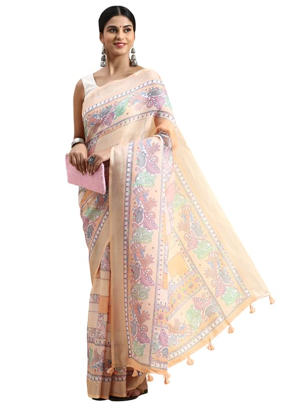 Women's Linen Zari Patta Saree with Digital Kantha Stitch Print & Multicolour Tassels | 5.5m Saree + 0.8m Unstitched Blouse Piece (KANTHA01 BOX SAREE)
