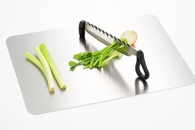 ✅ 2-IN-1 SMART DESIGN – Combines a sharp stainless steel knife with a built-in mini chopping board for fast, mess-free cutting.
