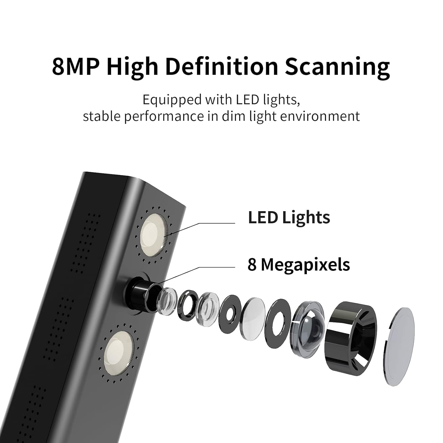 📄【Excellent Performance】Includes a 8MP camera (resolution: 3264*2448) and LED lights with adjustable brightness. Shine800 has a variety of useful features such as OCR, automatic tilt correction, front and back combination, etc. Notice: glossy materials(glossy photo,glossy magzine)are NOT recommended.