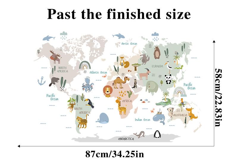 Dimension: 30 x 90 CM x 2 PCS | Wall covering area: 87 x 58 CM | Total Number of Objects: 40+ (World map with various animals and geographical elements)
