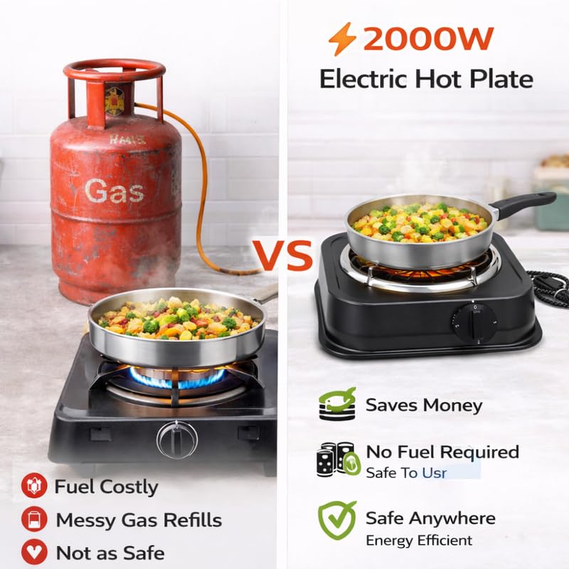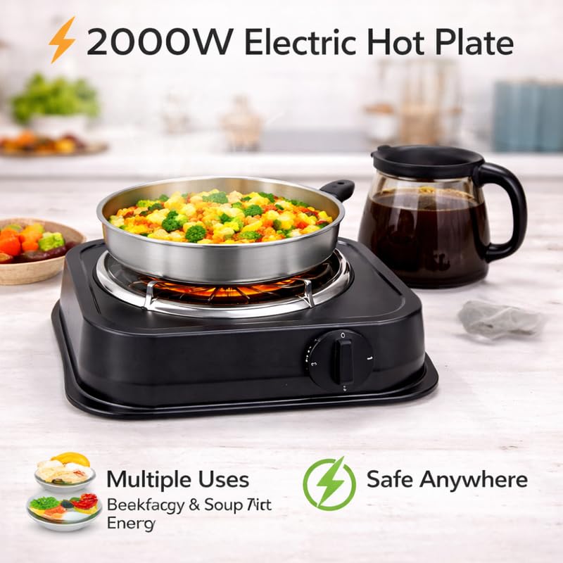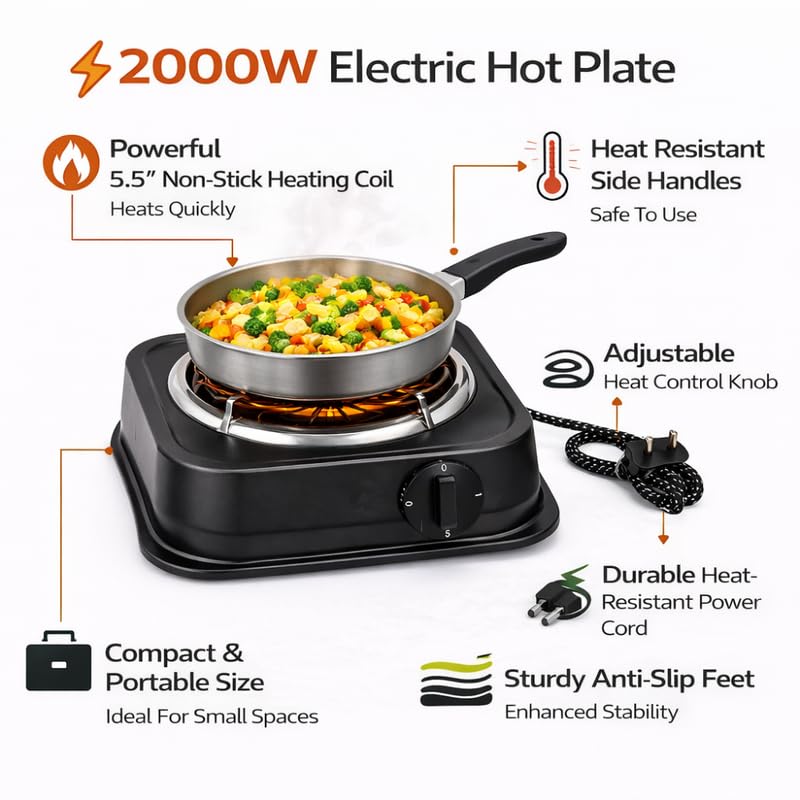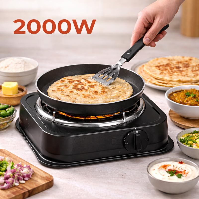 【𝐃𝐮𝐫𝐚𝐛𝐥𝐞 𝐚𝐧𝐝 𝐒𝐭𝐮𝐫𝐝𝐲 𝐌𝐞𝐭𝐚𝐥 𝐁𝐨𝐝𝐲】Built with a high-quality heavy-duty metal housing, this hot plate is engineered to last for years. The robust construction can easily support the weight of heavy flat-bottomed pans, kadhais, and tawas used in daily Indian kitchens. Unlike plastic body stoves, this metal finish is heat-resistant and prevents warping or melting, ensuring that the appliance remains stable and safe on your kitchen countertop during long cooking sessions.