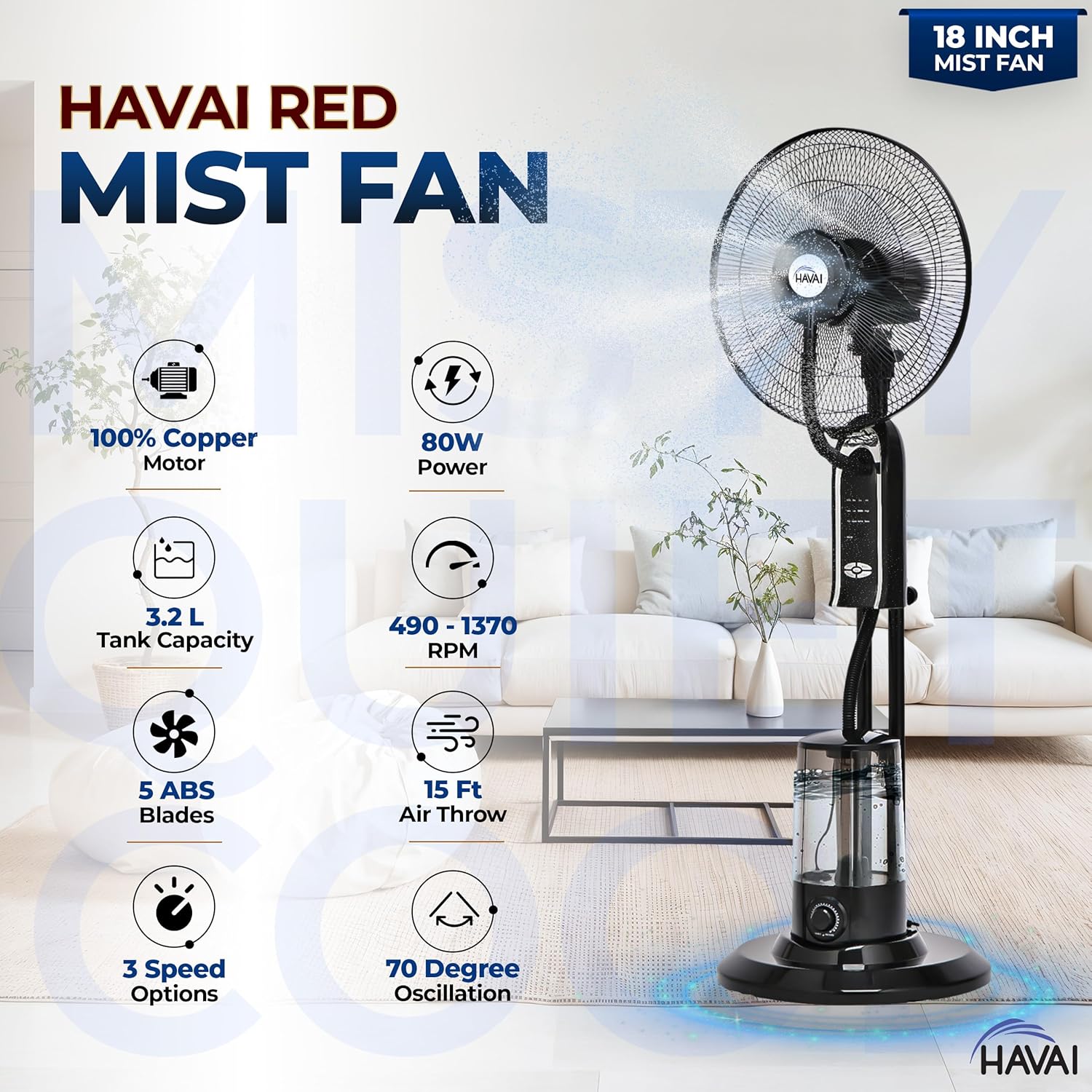 Copper Motor: Equipped with a durable copper motor, the HAVAI RED offers energy-efficient performance while ensuring powerful cooling. The advanced motor drives an impressive 10-metre mist throw, allowing the cool mist to reach and refresh every corner of your space, covering areas up to 350 square feet. Ideal for large rooms, outdoor patios, or office spaces, the long-range misting feature significantly reduces ambient temperature while adding moisture to dry air. With its energy-saving motor and superior mist distribution, the fan delivers consistent, cool comfort, making it a standout choice for hot climates.
