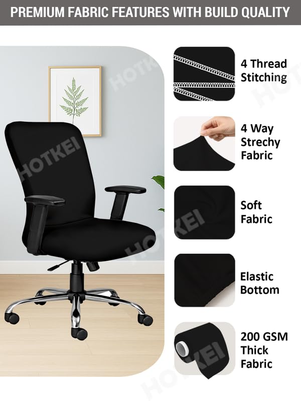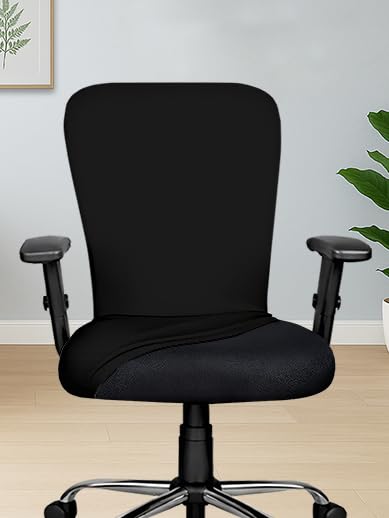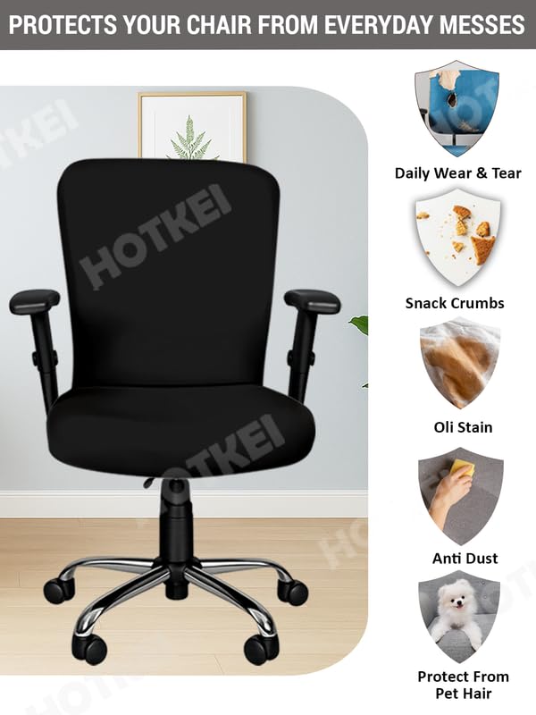 HOTKEI Stretchable office chair cover for office chairs is only fit to the executive computer chairs without headrest and to the chairs whose armrest is not attached to the chair back. PLEASE MEASURE YOUR CHAIR SIZE BEFORE ORDERING CHAIR COVER. HOTKEI Black 1 Piece pack of 1 Office chair cover Stretchable Solid Elastic Removable Washable Office Computer Desk Executive Rotating Chair Seat Covers Slipcover Cushion Protector -PACKAGE CONTAINS: 1 piece office chair cover. This Elastic office armchair cover slipcover gives your old damaged or ugly chair a new pretty look. And can extend the life of your office computer chair by protecting it from dirt, dust, food stain, spill, scratch, and other hurt and renew your furniture. Transform your old desk chairs into a sophisticated set, blending well with modern and traditional style. -The stretchable washable polyester and spandex chair cover material and elastic edge design keep this rotating chair cover steady and fit well, you can install and remove it from your chair easily and quickly. This washable chair cover can be washed by hand or machine. -This office chair cover material is soft and breathable, skin-friendly and comfortable, elastic and dustproof, durable and washable. – Best fit to the chairs with size: Chair back’s height: 55 cm – 65 cm, Chair back’s width: 45 cm – 50 cm, Chair seat length: 42cm – 50 cm, Chair seat width: 42 cm – 55 cm. PLEASE MEASURE YOUR CHAIR SIZE BEFORE ORDERING THE COMPUTER CHAIR COVER. – Easy to install: the instructional tag will guide you through the installation process easily. – Easy to care: Office Chair cover is machine washable in cold water. Do not bleach, tumble dry and low iron if needed.