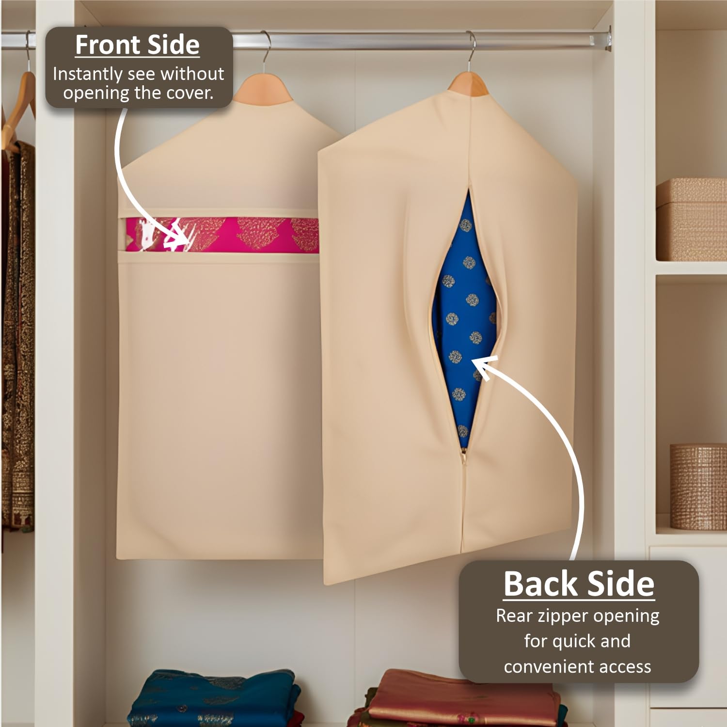 ππ©πππ-πππ―π’π§π πππ¬π’π π§: Designed to hang vertically, these hanging saree covers for wardrobe save space and keep your wardrobe tidy. They double as practical saree organisers for wardrobe use.