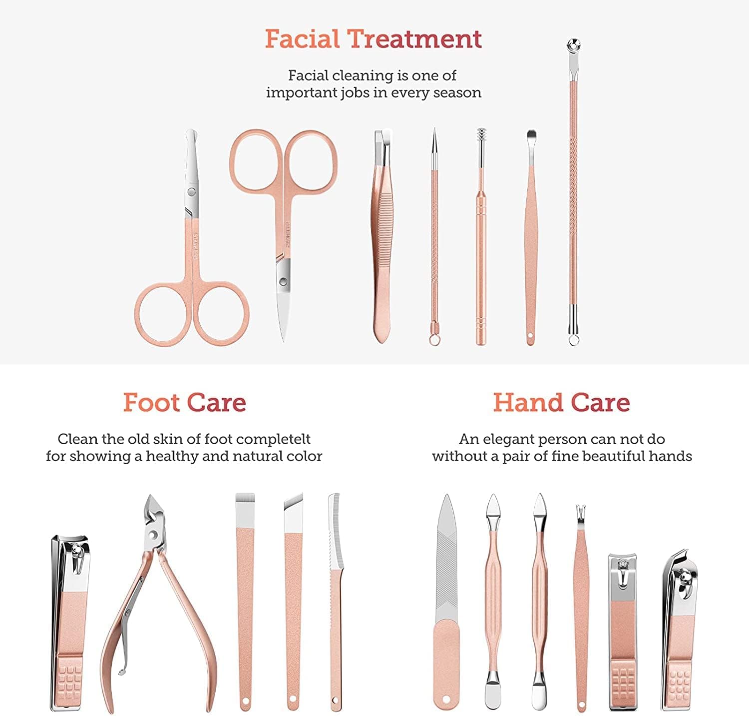 [Manicure Set, Pedicure set] This is a stylish, high-quality travel nail clipper set. It contains 18 Piece of facial care, hand care, foot care tools. The products are made of high-grade stainless steel after two strikes. Meet the various needs of your life. The high-quality PU travel box can accompany you to apply to various scenes. [Rose gold manicure kit] 16 Rose Gold Nail Care Tools Provide You With All kinds of help. [Manicure set woman] Close Knife Steel Push gently lifts the dead skin of nails Double Push Easily Pick Out DIrt In the nail gap Eyebrow scissors The arc design of the cutter head is convenient Nose Hair clipper The blade is round and does not hut the skin [Best gift for family,] friends This exquisite manicure pedicure set is the best gift for family, friends, and colleagues, don’t miss it.