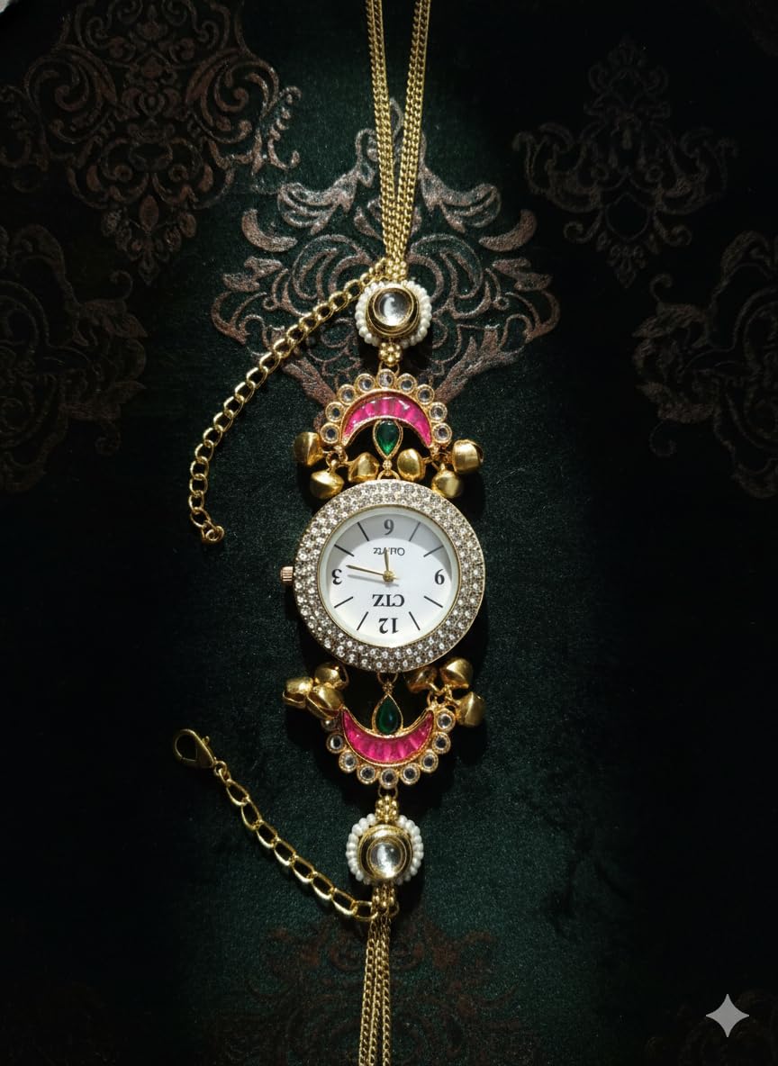 This exquisite Virasat Meenakari Round Dial Bracelet Watch seamlessly blends traditional Indian jewellery artistry with practical timekeeping functionality. Crafted with an ornate gold-tone finish, this stunning timepiece features intricate meenakari work adorned with vibrant pink and green decorative stones arranged in symmetrical patterns above and below the dial. The classic round dial, encircled by sparkling crystal embellishments, creates an eye-catching centrepiece that captures the essence of heritage craftsmanship. The delicate chain bracelet design includes ornamental elements and dangling bead embellishments that add authentic ethnic charm. With an adjustable chain and secure clasp, this versatile accessory ensures a comfortable fit for various wrist sizes. Perfect for festive occasions, traditional celebrations, weddings, or adding an elegant ethnic touch to everyday attire, this bracelet watch serves as both a functional timepiece and a statement jewellery piece. The quartz movement ensures reliable timekeeping whilst the decorative design showcases your appreciation for traditional Indian aesthetics. Please note this watch is not water resistant.