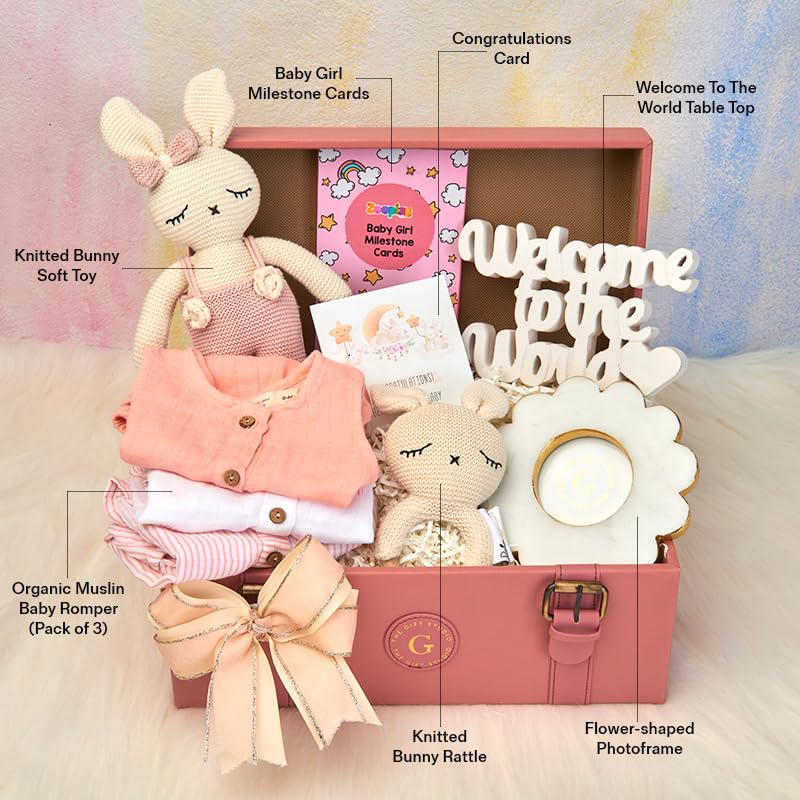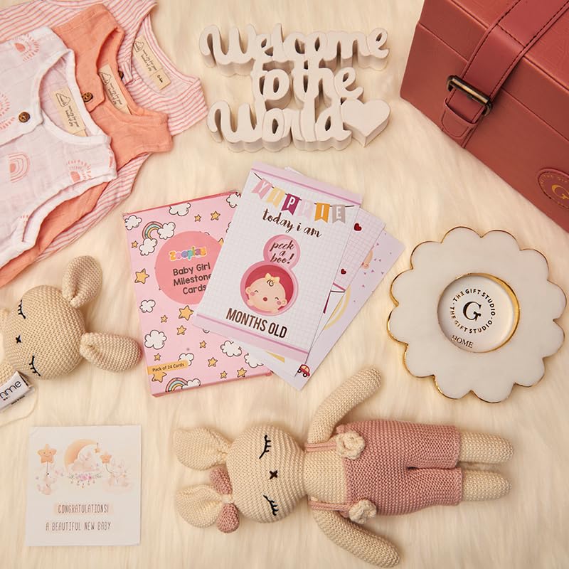 The arrival of a little princess deserves nothing short of royal celebration, and our Newborn Baby Girl Hamper is designed to do just that. This beautiful collection blends practicality with sentiment, making it more than just a gift?it?s a heartfelt treasure chest for the newest member of the family. With organic muslin rompers for everyday comfort, a knitted toy and rattle for playful beginnings, and milestone cards to capture her first achievements, every detail celebrates her journey. Keepsakes like the marble flower-cut frame and ?Welcome to the World? tabletop ensure her earliest moments are cherished forever. Beautifully presented in a luxurious ash pink leather briefcase, this hamper is the perfect way to congratulate new parents and welcome their baby girl in style.