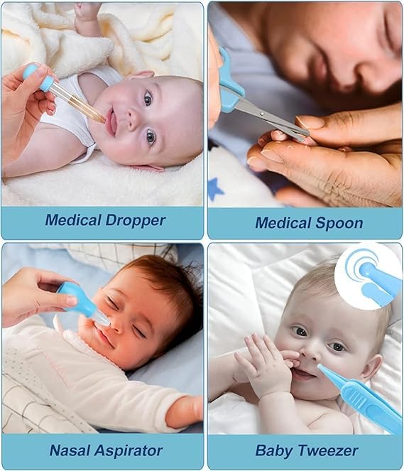Health Care Essentials: Digital thermometer, nasal aspirator, medicine dropper, and safety scissors to ensure safe and accurate baby care.