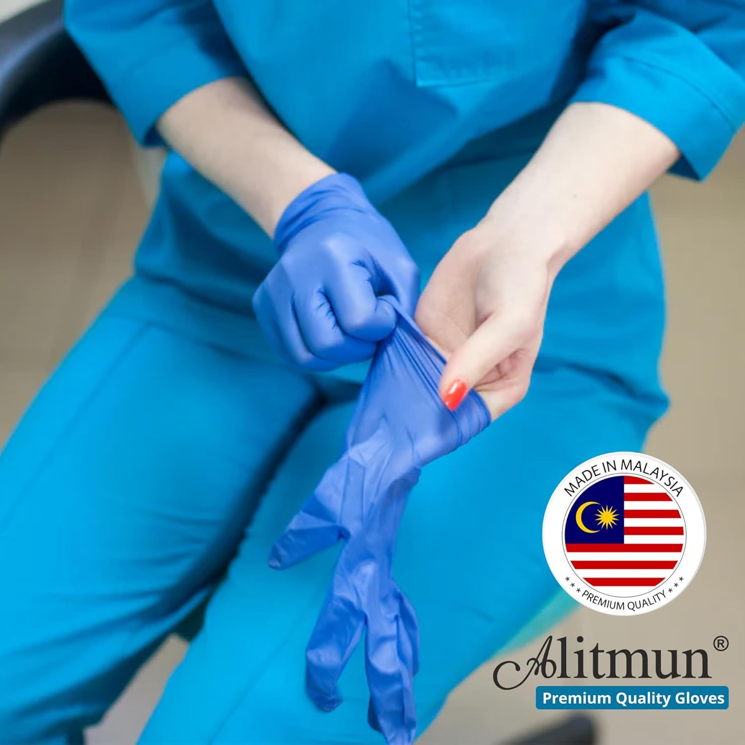 Material Nitrile Rubber Copolymer Disposable Yes USP Puncture proof Gloves with Smooth Surface Color True Blue Safe Choice Powder Free, Latex Free, Polythene Free, Harsh Chemical Free Gloves Brand Alitmun