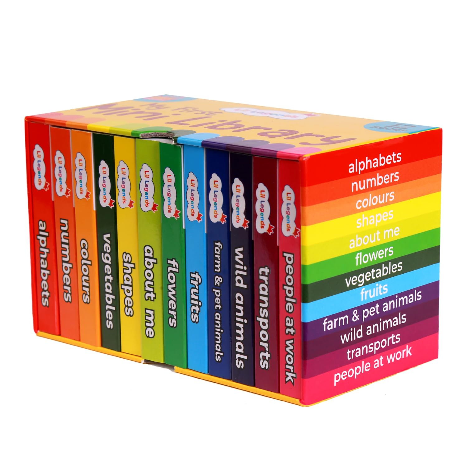 Oswaal Lil Legends Mini Library includes 12 baby board books on Alphabet, Numbers, Colors, Shapes, Animals, Vegetables, Fruits, and more. Perfect for captivating kids.