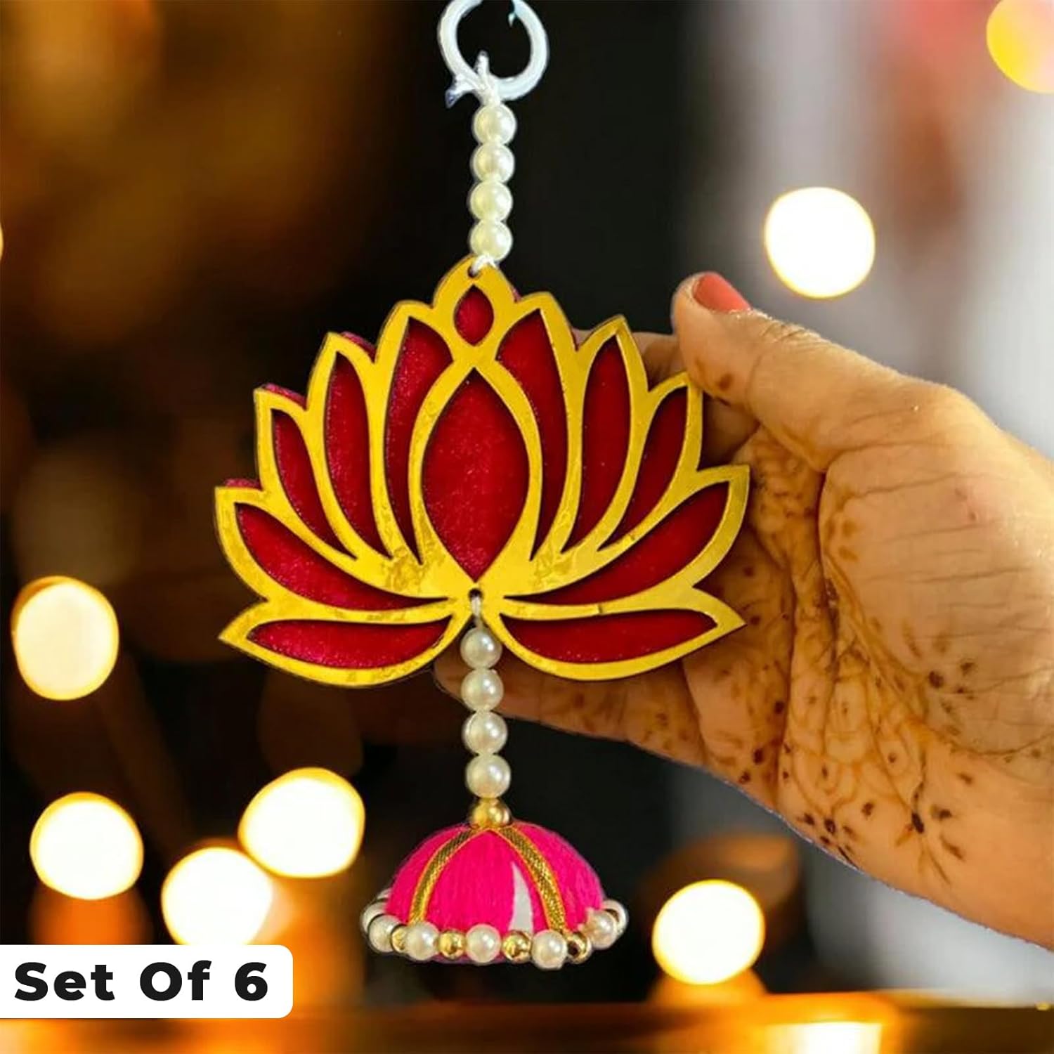 Lotus Wall Hanging with Jhumki – Set of 6 | Pink/Raani Lotus Home Decor for Diwali, Wedding, Temple & Festive Decoration | Export Quality Decorative Hanging for Pooja Room, Door & Wall Décor