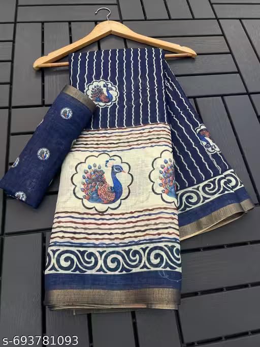 peacock design linen Kalamkari saree for women, crafted from soft and lightweight fabric for all-day comfort. Comes with a fancy blouse piece, making it perfect for casual wear, office wear, and festive occasions.