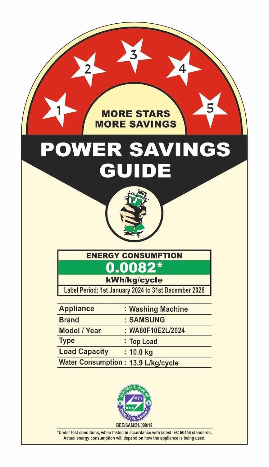 Energy Star rating : 5 Star- Best in class efficiency | Powered by AI Energy Mode and Digital Inverter Technology for Energy Savings (up to 20%) | Energy Consumption: 0.0082 KWh/kg/cycle (For more information refer to BEE Label)