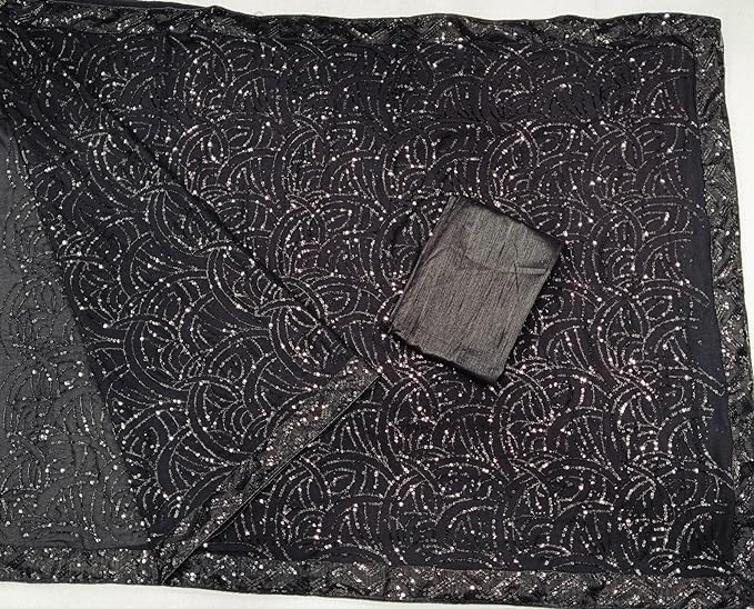 Turn heads at every event with this stunning black sequined saree. Crafted from lightweight georgette fabric, it drapes effortlessly, offering both comfort and elegance. The shimmering sequins add a glamorous touch, making it perfect for parties, weddings, and festive occasions. Paired with a luxurious Banglory silk blouse, this saree is the epitome of timeless sophistication. Embrace the beauty of black and sparkle with every step