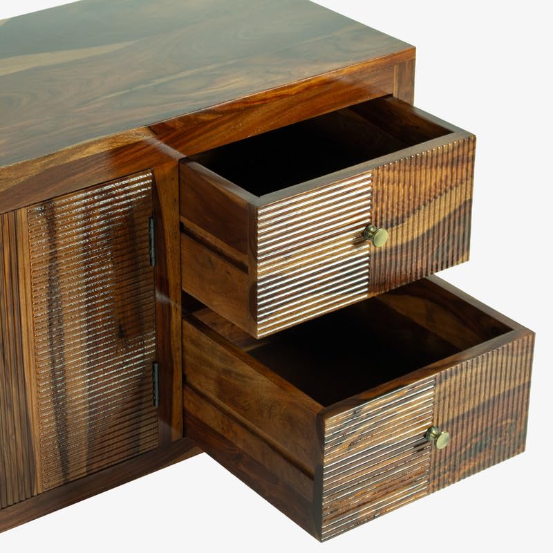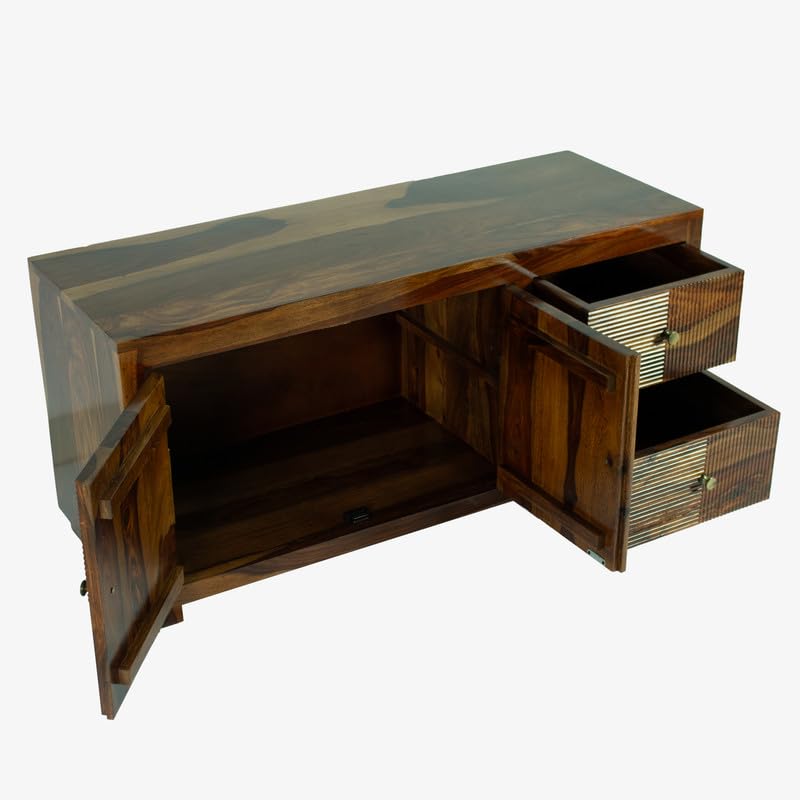 The WOODMAZE Solid Sheesham Wood TV Cabinet seamlessly blends style and functionality, making it an ideal addition to your living room, bedroom, or home entertainment area. Crafted from high-quality Sheesham wood, this TV cabinet boasts durability and showcases the distinctive grain patterns inherent to Sheesham. The unit features ample storage space, providing a practical solution to keep your living space organized. The combination of a TV entertainment unit and console table design adds versatility, allowing you to display decor or store media essentials. With its solid construction and timeless aesthetic, this Sheesham wood TV cabinet enhances the overall appeal of your space, offering a reliable and stylish solution for your entertainment needs.