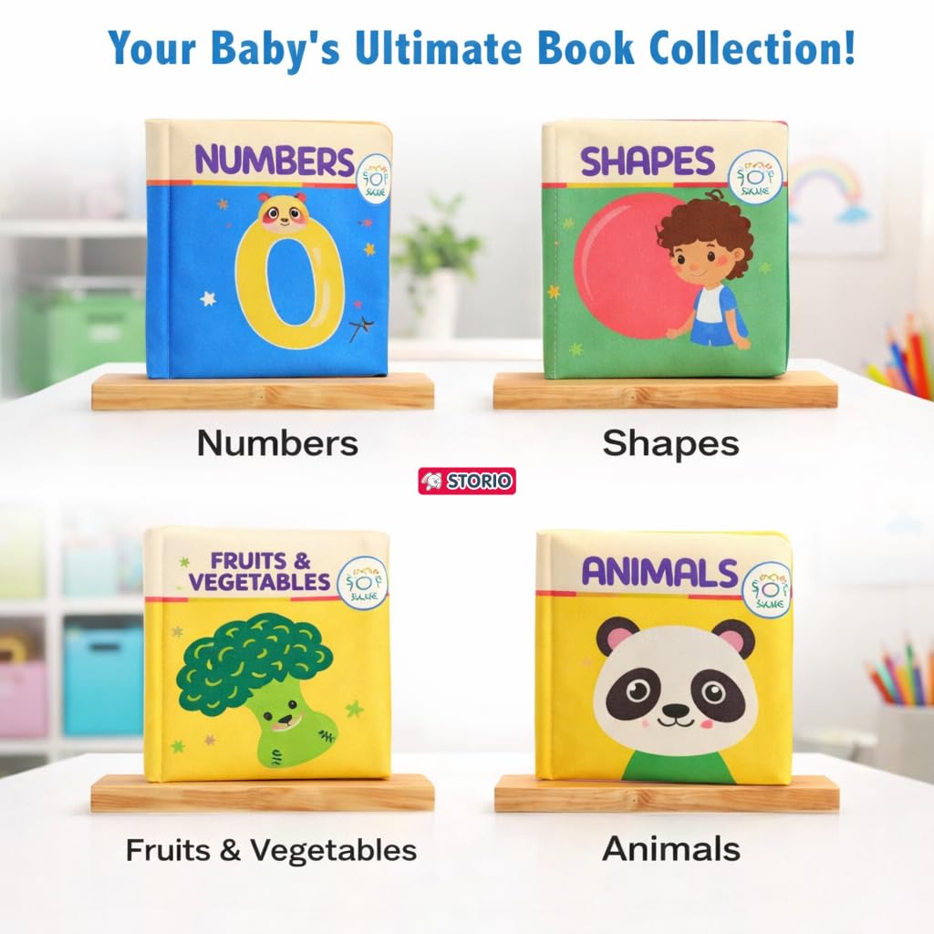 <br>Interactive Early Learning Themes – Engage your baby with vibrant cloth books featuring animals, fruits, vegetables, numbers & shapes to spark curiosity and learning.<br>Multi-Sensory Play – Crinkle sounds and soft textures stimulate auditory and tactile senses, encouraging exploration and interactive playtime.<br>Cognitive Development – Bright illustrations and relatable themes support early language, visual recognition, and cognitive skills.<br>Fine Motor Skill Growth – Flipping, squeezing, and grasping pages improve hand-eye coordination and refine fine motor abilities.<br>Safe & Baby-Friendly – Made from premium non-toxic fabrics, safe for chewing and handling, giving parents peace of mind.
