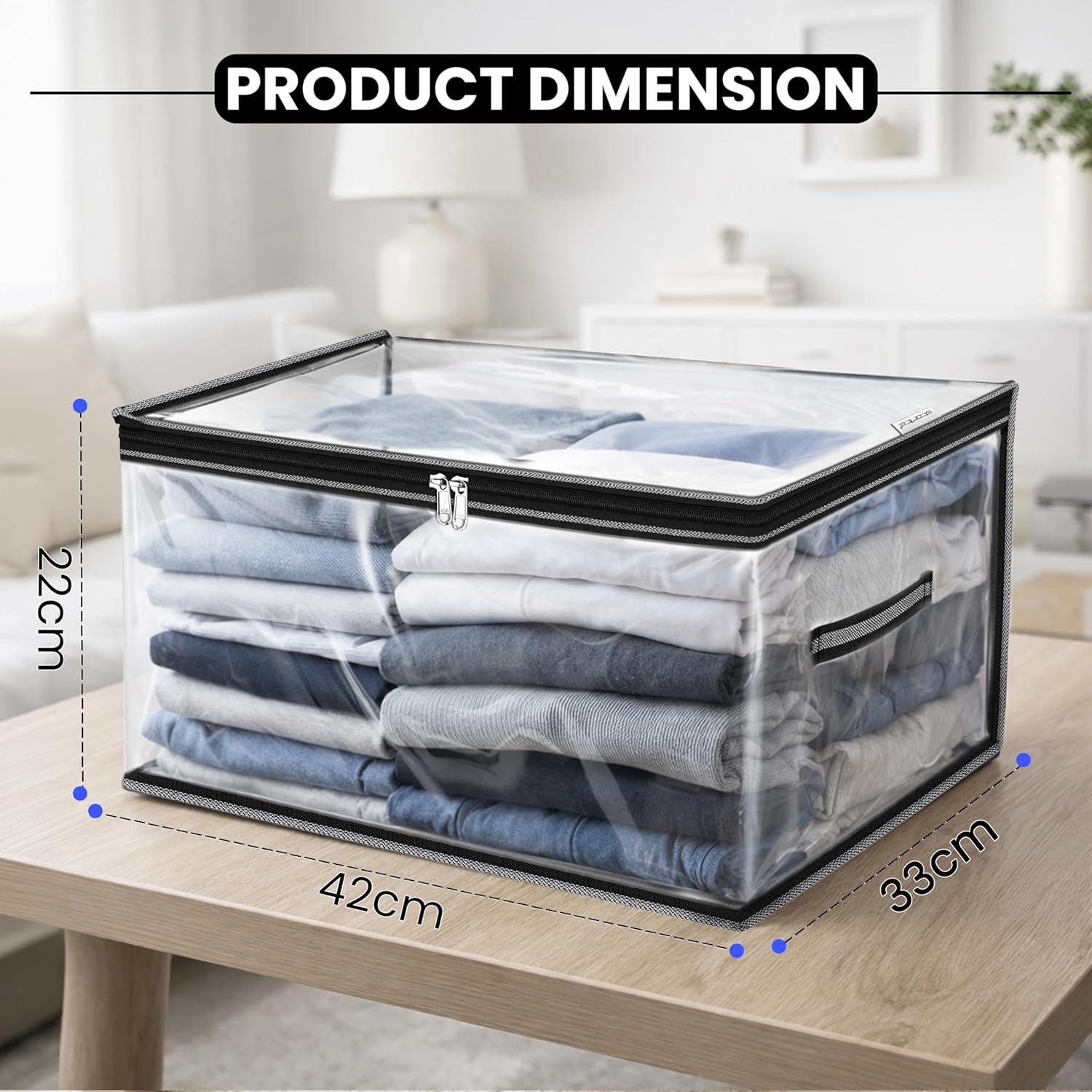 <br>Premium PVC Wardrobe Storage Bag (42x33x22 cm): Large capacity underbed storage organizer designed to store clothes, sarees, blankets, quilts, bedsheets, winter wear, and seasonal garments with ease.<br>Moisture-Proof & Dustproof Storage Solution: Made from high-quality PVC material that protects your clothes from moisture, dust, dirt, and insects, keeping fabrics fresh and well-maintained for long-term storage.<br>Underbed Storage Organizer with Transparent Window: Clear front panel allows easy identification of stored items without opening the bag, making wardrobe organization simple and time-saving.<br>Strong Zipper Closure for Secure Storage: Durable and smooth zippered closure ensures complete protection while allowing quick and convenient access to clothes and household items.<br>Reinforced Side Handles for Easy Carrying: Sturdy stitched handles make it easy to pull out from under the bed, move between rooms, or carry during shifting and travel.<br>Multipurpose Cloth Storage Box for Home Organization: Ideal for storing saree bags, garment storage, kids’ clothes, towels, blankets, comforters, and linen. Perfect for bedrooms, wardrobes, closets, hostels, and apartments.<br>Space-Saving Foldable Design: Lightweight and foldable storage bag that can be easily folded flat when not in use, helping maximize closet and underbed space.