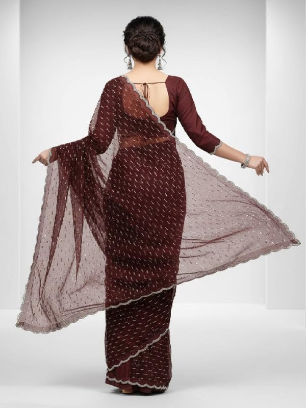 Elevate your ethnic wardrobe with this exquisite Twill Net saree, perfect for festival occasions and special celebrations . Crafted from premium quality Twill Net fabric, this power loom-woven saree offers a graceful drape and comfortable wear. The saree comes with a matching regular Banarasi Silk blouse piece of 80 centimeters, completing the ensemble beautifully. The plain weave pattern in a solid color scheme makes it versatile for various styling options. With a generous length of 5.5 meters, this saree ensures proper coverage and elegant pleating. The set includes all necessary components with the blouse piece, making it ready for styling. This standard-size saree requires dry clean only care to maintain its pristine appearance. Crafted in India, this saree combines traditional aesthetics with contemporary design elements, making it a perfect choice for your festive wardrobe. This Saree Embellished with Hot Fix diamonds on Border and all over saree for beautiful look that makes it perfect for festivals and occasions like Navratri, Deepawali, weddings and all other festivals.