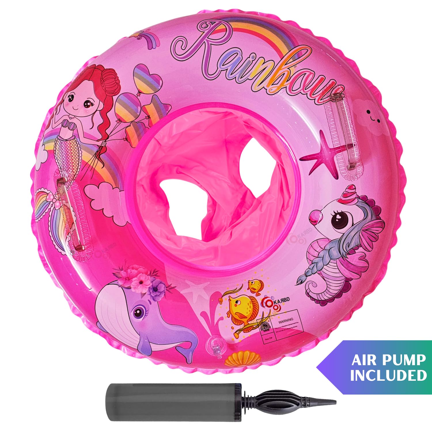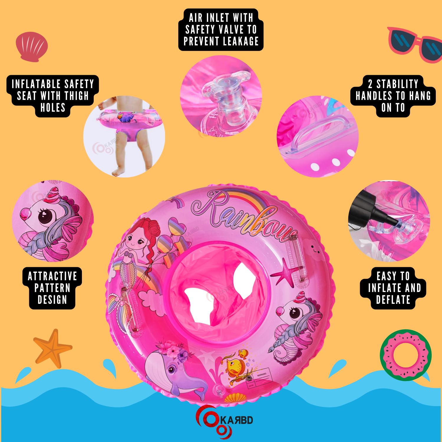 KARBD Swimming Ring with seat space, leg Holes and handles comes in an attractive and colourful design which can arouse the interest of the baby easily, while ensuring the safety.