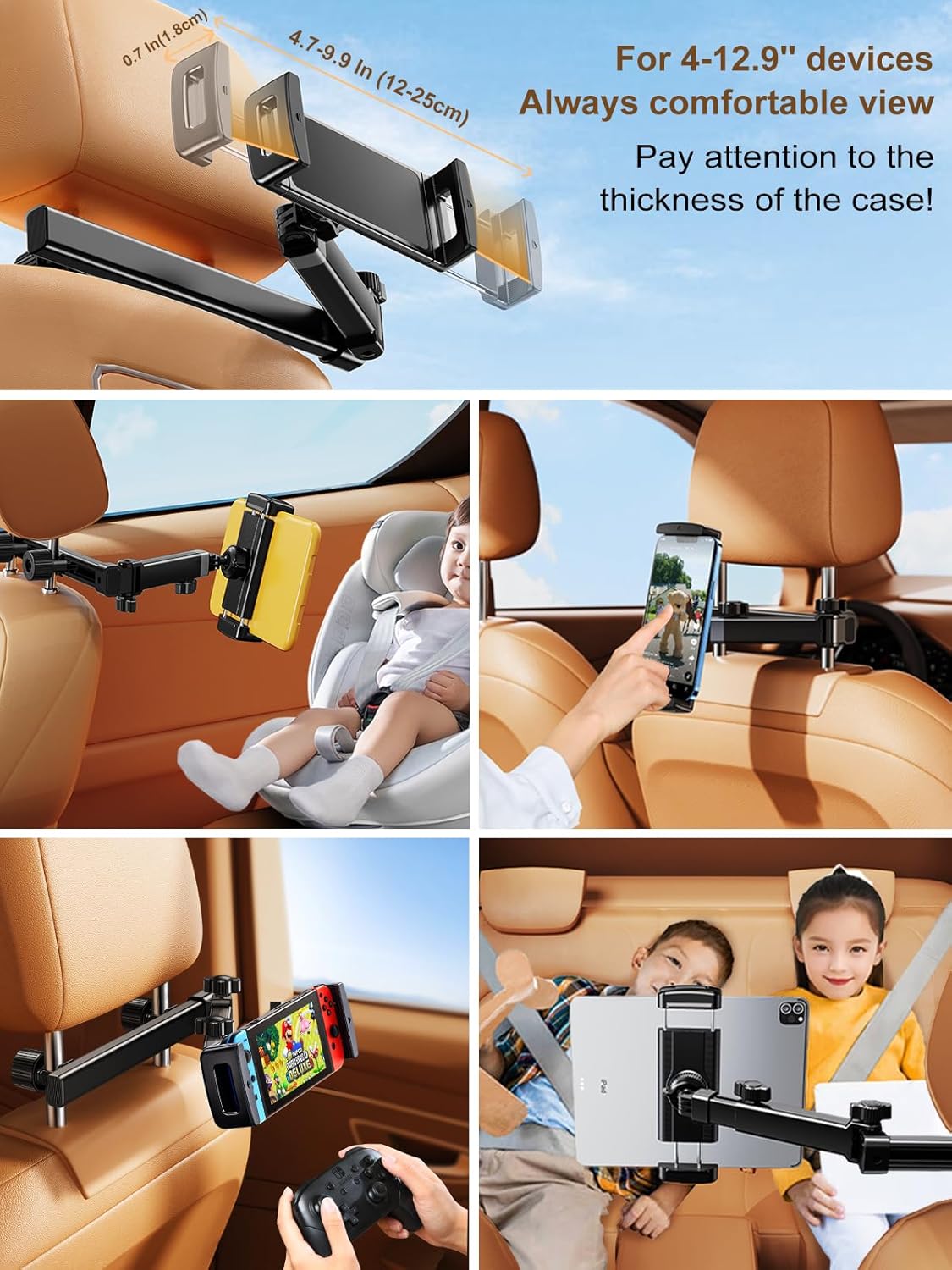 【Device Compatibility】The ipad car holder back seat is suitable for all 4.4-12.9 inch devices, including the new 2025/2024/2023/2022/2021/2020 iPad Pro/Air/Mini 10/9/8/7/6/5/4/3 generation. Suitable for Galaxy Tab, iPhone 16/15/14/13/12/11 Pro Max Mini, Switch, Amazon Fire HD 8/9/10 kids tablet, and other smartphones and tablets. Note: The clip width is 4.7-9.9in. If the device is wearing a protective case, you must measure the size in advance to avoid being unable to use it.
