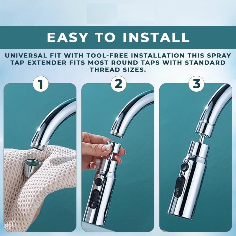 Durable and Easy-to-Install Build: Crafted from high-quality ABS plastic and stainless steel, the extender is sturdy, rust-resistant, and long-lasting. With its tool-free, universal installation, it can be easily attached to most standard kitchen and wash basin taps.
