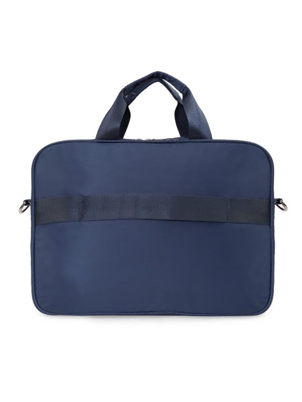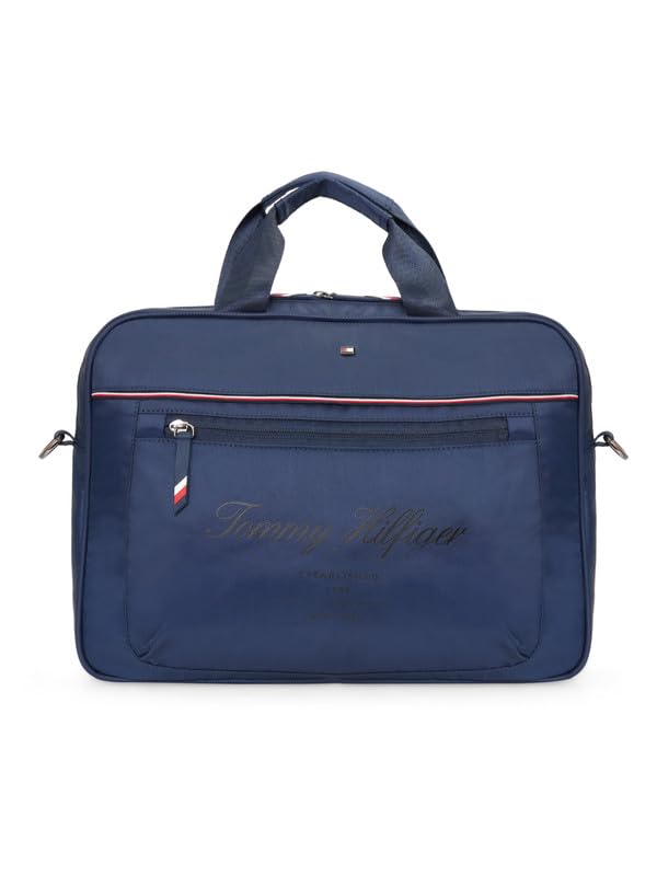 Elevate your professional style with the Tommy Hilfiger WRANGELL Business Case in classic NAVY. This unisex laptop bag is crafted from a high-quality, water-resistant twill textured polyester fabric, combining durability with a sophisticated aesthetic. The single main compartment is equipped to protect your tech, featuring a padded laptop sleeve that fits up to a 14-inch device and a separate I-Pad slot. Stay organized on the go with a multi-utility organizer that includes a metal dog hook for your keys, and a front zipper pocket for quick access to essentials. Carry it with ease using the dual nylon straps or attach the adjustable and detachable shoulder strap for comfort. For seamless travel, a trolley sleeve is included on the back, allowing you to secure the bag to luggage. This product is a warranty item and comes with a one-year warranty against manufacturing defects.