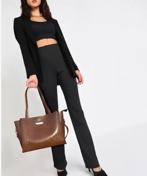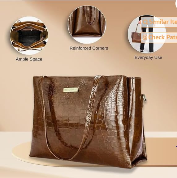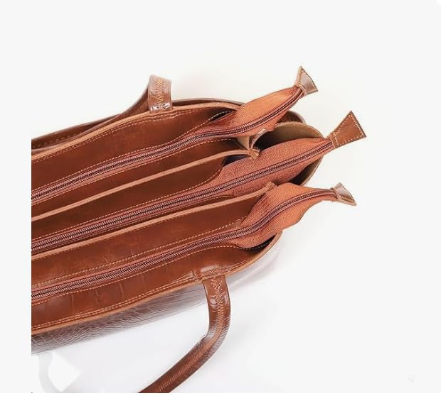 Elevate your style with this sophisticated brown leather handbag featuring an exquisite crocodile pattern texture. The luxurious design showcases a sleek metallic nameplate that adds a touch of elegance, while the practical shoulder straps ensure comfortable carrying. The spacious interior, lined with durable fabric, offers ample room for your daily essentials, making it perfect for both work and leisure. The bag’s structured silhouette maintains its shape beautifully, complemented by high-quality hardware and precise stitching. The rich brown colour and classic design make it a versatile accessory that pairs effortlessly with both formal and casual attire. Multiple compartments help keep your belongings organised, while the top closure ensures your items remain secure. This timeless piece combines functionality with sophisticated style, making it an essential addition to any fashion-conscious individual’s collection.