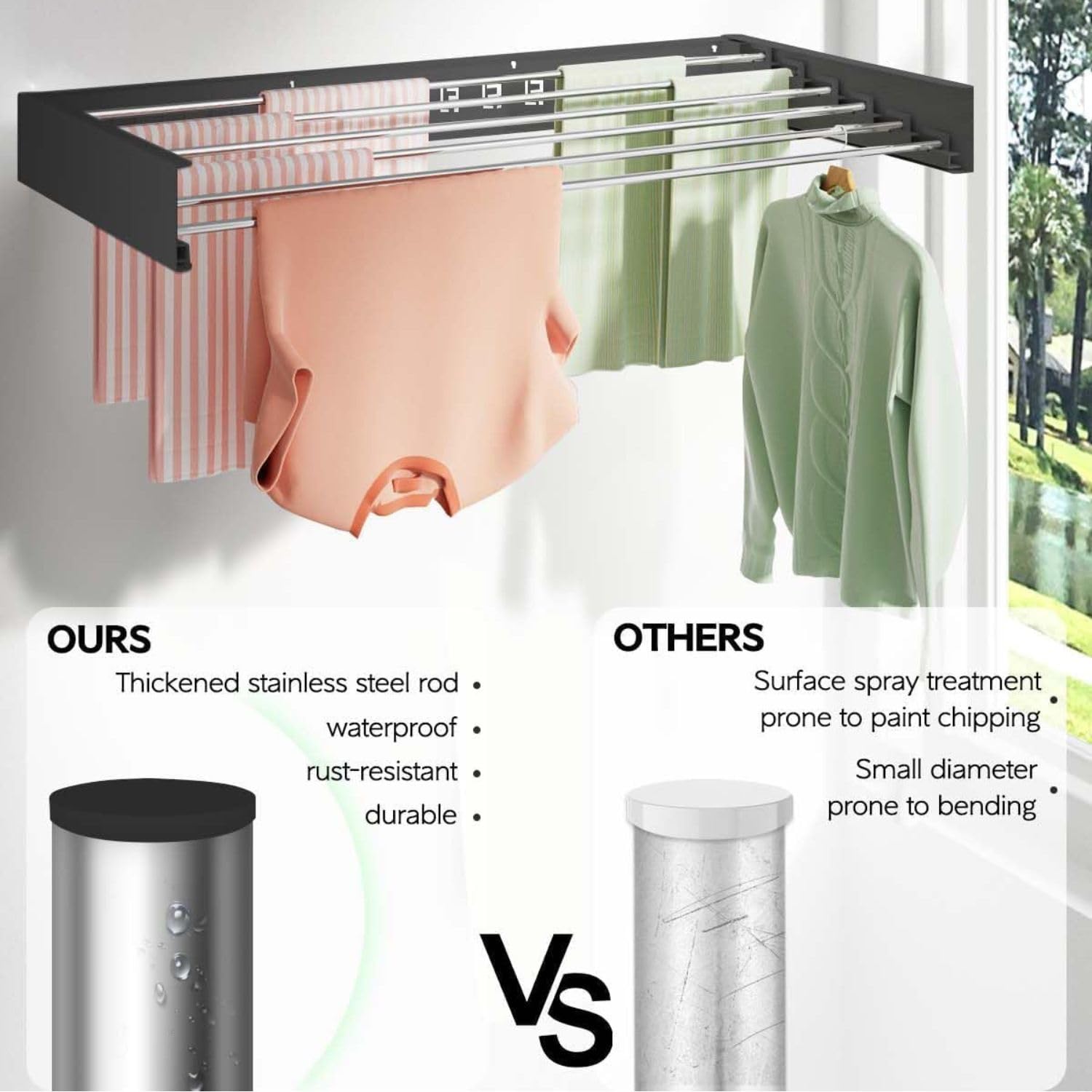 Space-Saving Design : When not in use, the drying rack clothing folds flat against the wall—compact, hidden, and out of the way. Perfect for small spaces. Wide-spaced rods allow faster drying and fit hangers easily. Compact yet holds plenty of clothes.