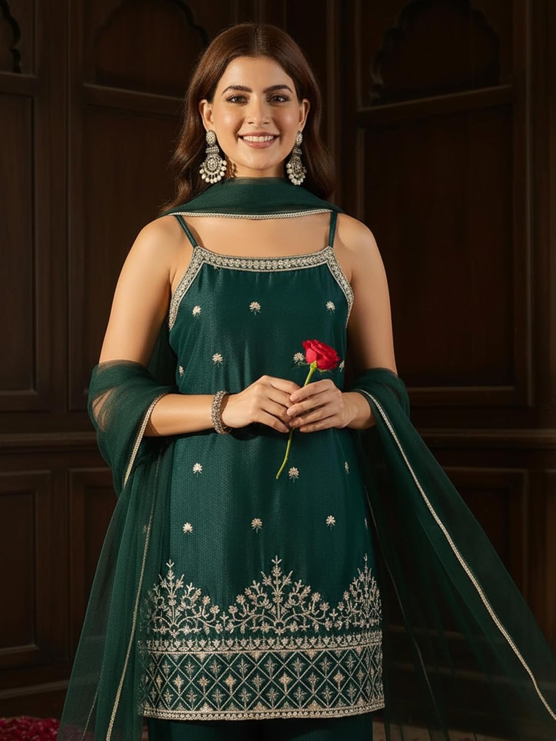 Enhance your ethnic fashion collection with this Dark Green Georgette Kurta Set for Women, designed to offer elegance, comfort, and timeless traditional style. This women’s ethnic kurta set with dupatta is ideal for festive wear, wedding functions, parties, family gatherings, and traditional occasions. Made with premium-quality fabrics, this outfit reflects modern ethnic fashion while maintaining a classic Indian look.The kurta is crafted from soft and lightweight Georgette fabric, known for its smooth texture, graceful drape, and breathable comfort. The rich dark green / emerald green color kurta set gives a royal and sophisticated appearance, making it a perfect choice for both daytime celebrations and evening events. The kurta features beautiful embroidery work that adds charm and enhances its designer appeal, making it a stylish kurta set for women who prefer elegant ethnic wear.The set includes a matching Georgette bottom, offering a comfortable fit and effortless movement throughout the day. Its smooth fabric ensures long-lasting comfort, making it suitable for extended festive occasions, wedding ceremonies, and party wear. The look is completed with a sheer net dupatta, which adds a delicate and graceful touch to the overall outfit. The dupatta flows beautifully and complements the embroidered kurta, giving the ensemble a polished and festive finish.This Georgette kurta set for women is perfect as festive wear, wedding wear, party wear kurta set, traditional Indian wear, and ethnic dress for women. It pairs well with juttis, heels, statement earrings, and bangles for a complete ethnic look. Ideal for festivals like Diwali, Eid, weddings, engagements, puja functions, and celebrations, this designer kurta set with dupatta is a must-have for every modern woman’s wardrobe.