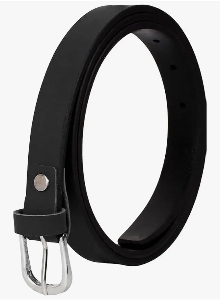 Elevate your style with this versatile black PU leather belt, perfect for both casual and formal occasions. This sleek accessory features a classic silver-toned buckle design that adds a touch of sophistication to any outfit. The belt’s slim profile makes it ideal for threading through jean loops or cinching dresses and formal trousers. Crafted from durable PU leather material, this belt offers long-lasting wear while maintaining its polished appearance. The adjustable design accommodates waist sizes up to 91 centimetres (36 inches), making it a practical choice for various body types. Its timeless black colour ensures seamless coordination with any wardrobe palette, while the neat stitching detail demonstrates quality craftsmanship. Whether paired with jeans for a casual day out or formal wear for special occasions, this belt serves as an essential wardrobe staple for women and girls alike.