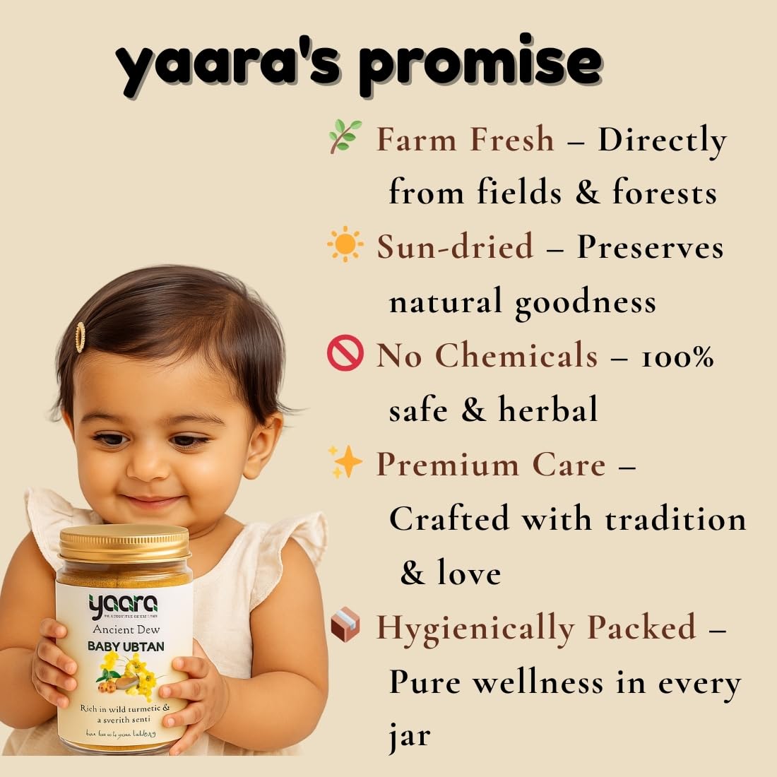 <img alt="baby ubtan" src="https://images-na.ssl-images-amazon.com/images/G/01/x-locale/common/grey-pixel.gif" class="a-spacing-base a-lazy-loaded" src="https://m.media-amazon.com/images/S/aplus-media-library-service-media/e1c6998b-9cde-4d6e-adcf-4dee06e99c5c.__CR0,0,970,600_PT0_SX970_V1___.png"><img alt="baby ubtan" src="https://m.media-amazon.com/images/S/aplus-media-library-service-media/e1c6998b-9cde-4d6e-adcf-4dee06e99c5c.__CR0,0,970,600_PT0_SX970_V1___.png">                                                                     <p class="a-spacing-base"> Rooted in tradition, crafted with care. </p>     <p class="a-spacing-base"> Yaara believes baby care should be gentle, honest, and inspired by age-old Indian rituals. </p>        <p class="a-spacing-base"> Hero ingredients that matter. </p>     <p class="a-spacing-base"> Wild Turmeric and Aavaram Senna form the heart of our formulations - chosen for their time-trusted role in traditional baby care. </p>        <p class="a-spacing-base"> Thoughtfully balanced, never overloaded. </p>     <p class="a-spacing-base"> Each ingredient is included with purpose, avoiding unnecessary fillers or harsh elements. </p>        <p class="a-spacing-base"> Made for real mothers, real routines. </p>     <p class="a-spacing-base"> Easy to use, soft in texture, and designed to fit naturally into everyday baby bath rituals. </p>        <p class="a-spacing-base"> Care you can trust. </p>     <p class="a-spacing-base"> From sourcing to blending, Yaara focuses on simplicity, purity, and transparency—because your baby deserves nothing </p>